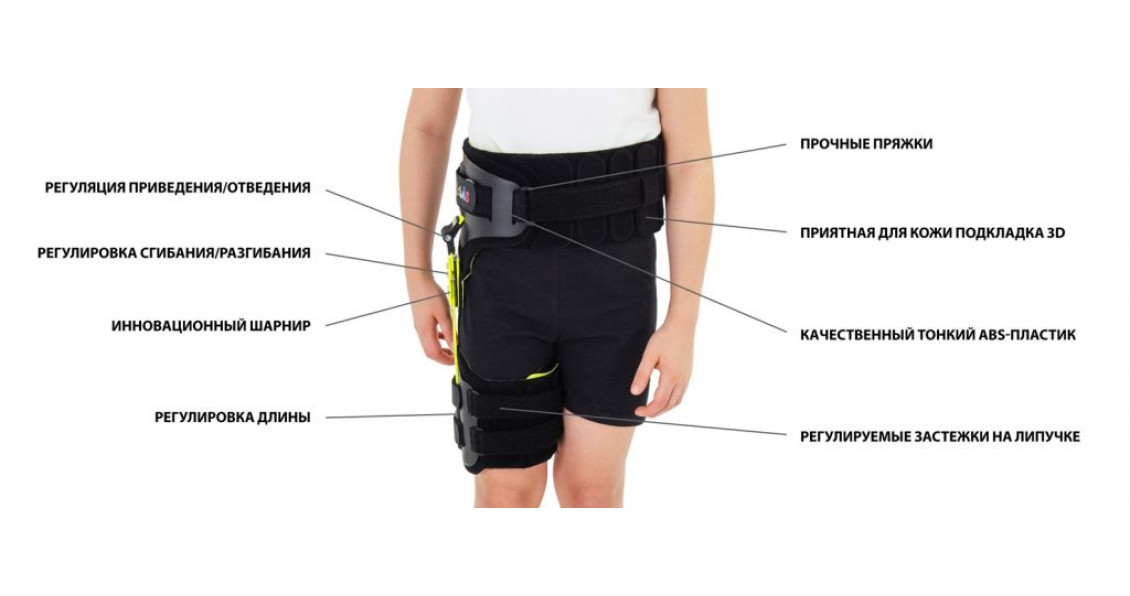Детский ортез бедра FIX-KD-20 ограничивает сгибание-разгибание в тазобедренном суставе, исключает ротацию сустава и регулирует отведение бедра. Ортез состоит из мягких рукавов на бедро и таз, усиленной универсальной шины с регулируемым углом подвижности суставов и функцией регулировки отведения конечностей и фиксаторами бедра и таза изготовленных из АБС-пластика и имеющих регулировку по высоте.