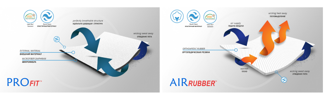 Прилегающий к коже слой изготавливается из микрофибры, эластана и хлопка – отличается мягкостью, не вызывает аллергии, отводит пот, не натирает