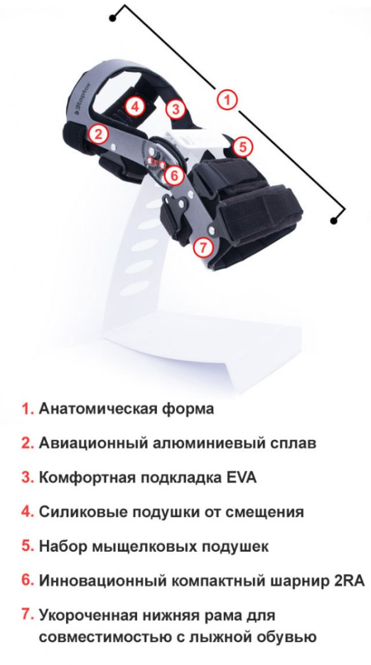 Ортез RAPTOR 2RA SHORT имеет 4-точечную систему поддержки, которая отлично стабилизирует и разгружает коленный сустав. Точки приложения – рама на передней части бедра, рама на задней части голени, ремень поперек нижней части бедра толкающий бедренную кость вперед и передний ремень на голени, предотвращающий ее смещение.