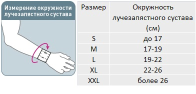 Для правильного выбора подходящего размера лучезапястного ортеза Orlett ManuFlex DWR-202 необходимо сантиметровой лентой измерить окружность лучезапястного сустава и воспользоваться таблицей: