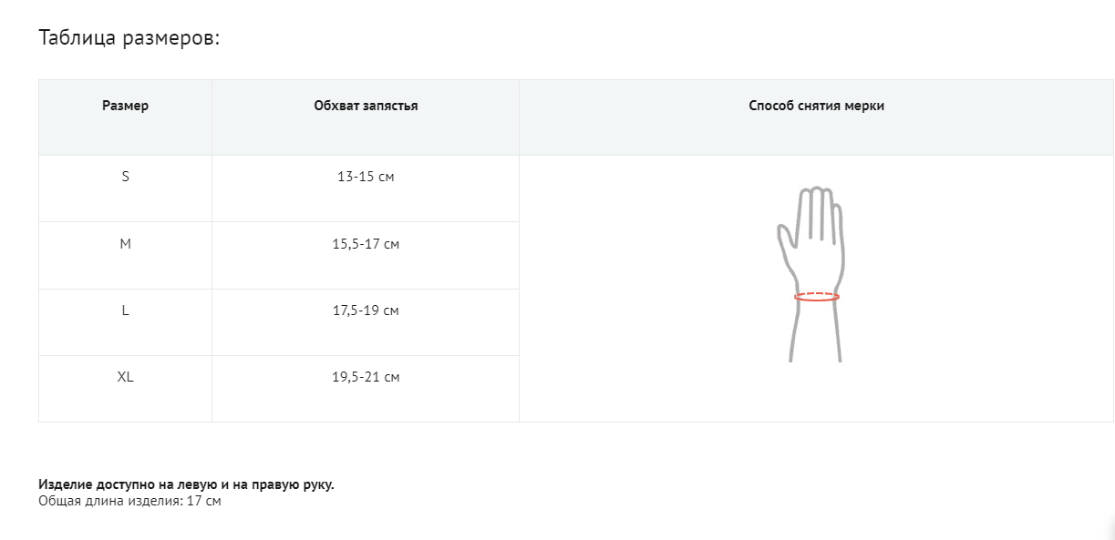 Изделие оснащено анатомически профилированной шиной фиксирующей запястье, а также лентой VELCRO, способствующей идеальному прилеганию изделия к конечности.