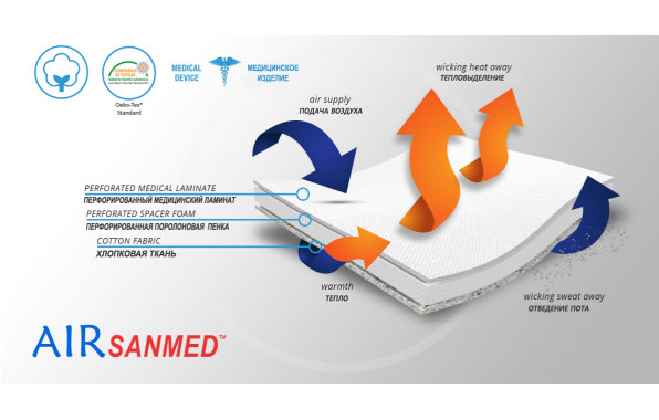 Особенность этого материала в том, что он неэластичный, поэтому улучшает стабилизацию. Подкладка из дышащей махровой хлопчатой ткани, имеющей антибактериальные компоненты на основе цеолита серебра. Внутренний слой состоит из перфорированной комфортной пенки EVA, защищающей кожу от жестких частей ортеза, а снаружи находится медицинский перфорированный ламинат для лучшей вентиляции и отвода пота.