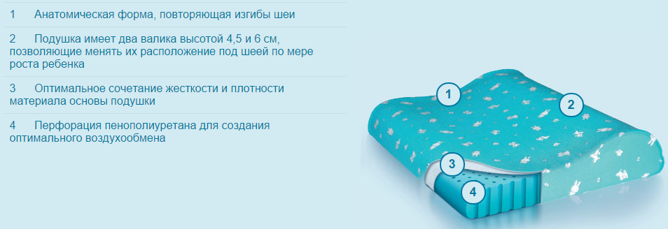Анатомическая форма, повторяющая изгибы шейного отдела позвоночника, сочетание жесткости и плотности подушки, создают оптимальные условия для комфорта ребенка, улучшают качество и глубину сна