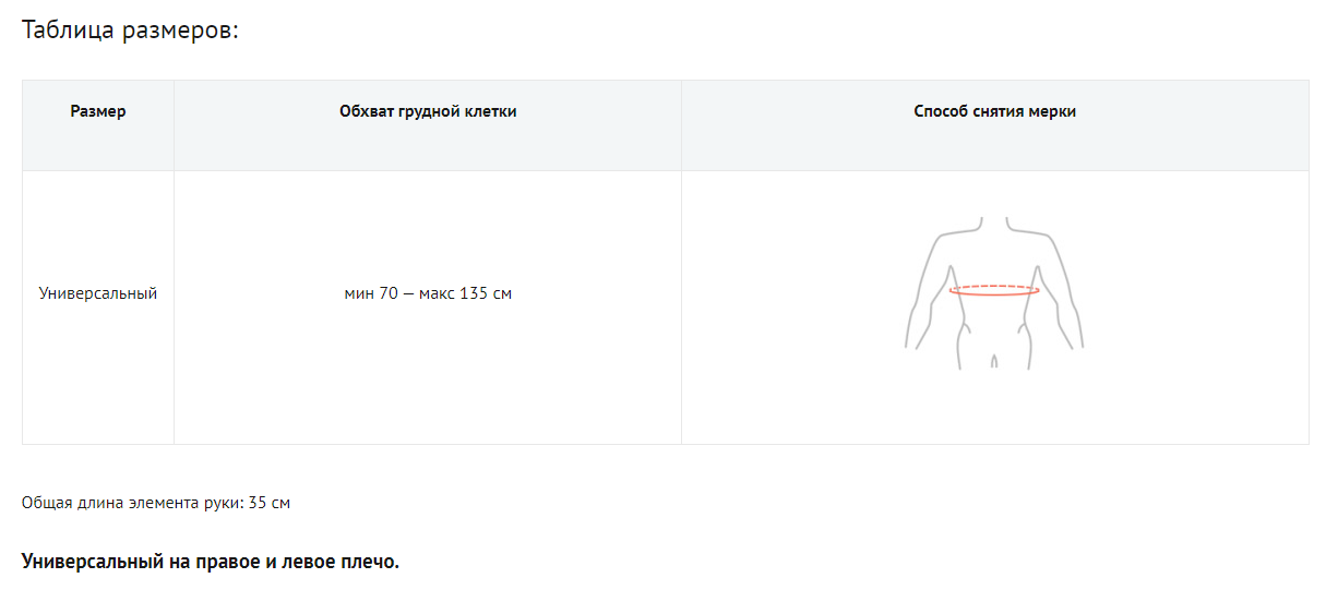 Изделие обеспечивает компрессию и правильное позиционирование плечевого сустава в области вращательной манжеты, ускоряет рассасывание отеков, не ограничивает мобильность пользователя.